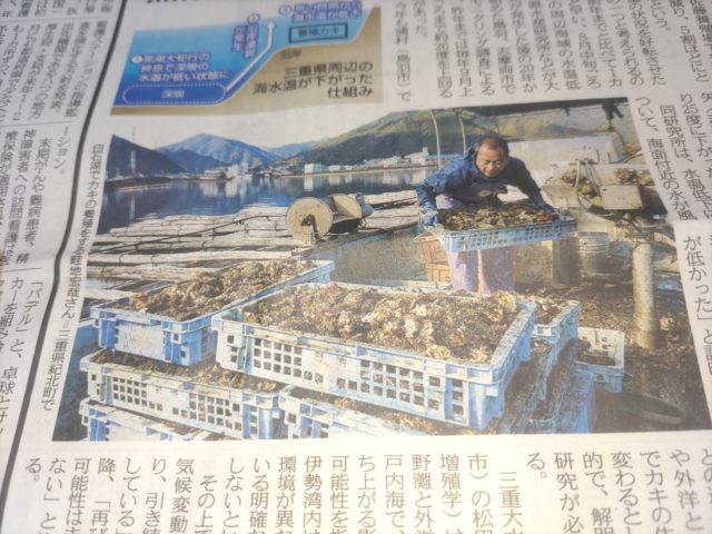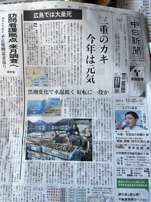 本日12月22日付けの中日新聞 1面にて三重の牡蠣について紹介されました。